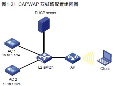 AC 1 与AC 2 分别连接到一台二层交换机。AP 通过该二层交换机连接到AC 1 和AC 2。AC 1、AC2 与AP 都接入同一个网络。AP 通过DHCP 服务器获取IP 地址,AC 1 的IP 地址为10.18.1.1,AC2 的IP 地址为10.18.1.2。AC 1 工作在主用状态,AC 2 工作在备用状态。要求当AC 1 失效后,AC2 立即成为主用无线控制器,且通过备用信道连接到AC 2 的AP 将该备用信道转换为主用信道,使用AC 2 作为主用无线控制器。二、组网图