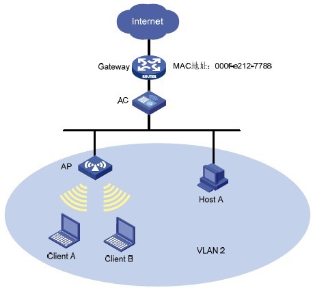网关 Gateway 的MAC 地址为000f-e212-7788。要求通过配置实现用户隔离,要求VLAN 2 中的用户Client A、Client B 和Host A 可以访问Internet,但是VLAN 2 中的用户之间都不可以相互访问。二、组网图