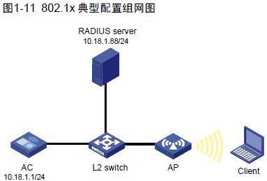 AC 和RADIUS 服务器通过二层交换机建立连接。AC 的IP 地址为10.18.1.1,与AC 相连的RADIUS 服务器的IP 地址为10.18.1.88。 要求使用 802.1X 方式进行用户身份认证。二、组网图
