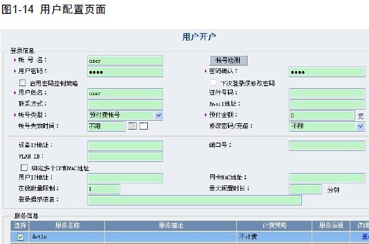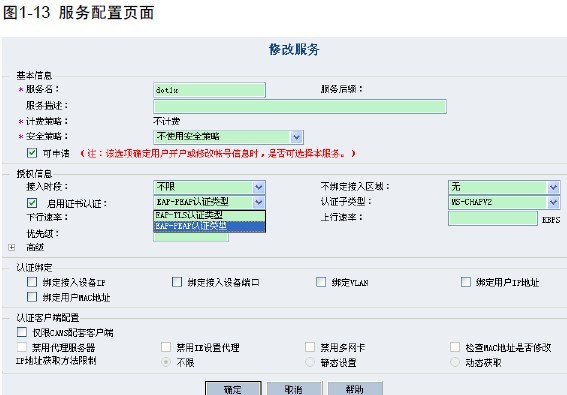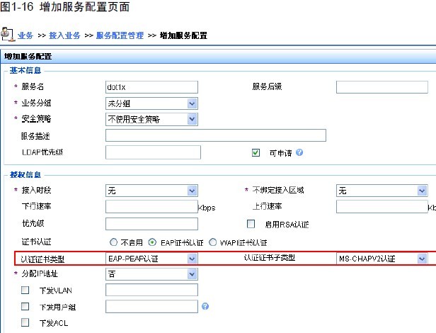 点击左侧菜单树中[服务管理]->[服务配置],在服务配置列表中,选择“增加”。添加服务名,这里选择不计费。选中“启动证书认证”,选择“EAP-PEAP 认证类型”和认证子类型中“MS-CHAPV2”。