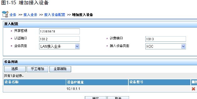 选择或手工增加接入设备,添加 IP 地址为10.18.1.1 的接入设备。