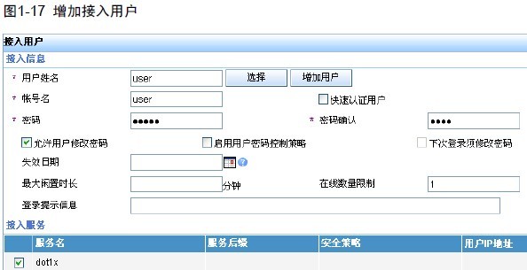 添加帐号名为 user,密码为dot1x;