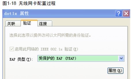 选择无线网卡,在验证对话框中,选择 EAP 类型为PEAP,点击“属性”,去掉验证服务器证书选项(此处不验证服务器证书),点击“配置”,去掉自动使用windows 登录名和密码选项。然后“确定”。整个过程如下图所示。