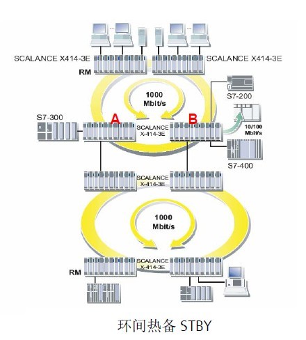 环网之间的冗余备份STBY,通过两套交换机各自连接都另外一个黄网的两台交换机上,如图环间热备STBY。仅仅需要在同一个环网中的两个交换机A和B通过网络相互交换数据来同步它们的运行状态,其中设备作为Master,另外一台设备作为Slave。在网络正常的情况下,仅仅是Master与另外一个环忘的连接是激活的,即通讯数据通过该连接完成两个环网之间的通讯,如果Master的连接断开或者Master交换机故障,这时Salve会激活其连接,这时两个环网之间的数据就通过Slave来连接完成。如果故障恢复,Master会重新作为环网之间的激活连接。STBY可以是电气连接也可以是光纤连接。另外,可以利用SCALANCE X408的千兆端口,组成千兆环网冗余热备。