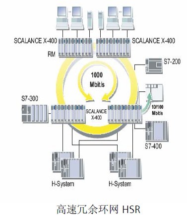 冗余环网,各台交换机通过同于环口一次进行连接,如图高速冗余环网HSP。 SCANLANCE X400 可以作为冗余管理器RM,管理冗余环网,为了保证系统快速重构和稳定性最多50 个交换机连接在环上,除了其他交换机需要设置冗余环口,在网络正常的情况下,RM的其中一个冗余环口会断开状态,这样整个网络处于一种线型结构,冗余管理监视网络状态,当网络连接线断开或者交换机故障,它会通过一个替代路径恢复另外一种线型结构。整个网络重构时间小于0.3s,如果问题被消除,会恢复原有的线型结构,在一个环网中只能存在一个RM管理器,环网可以是电气环网,也可以是光纤环网,也可以是两者混合。