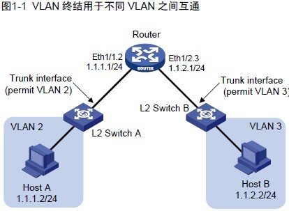 不同VLAN间的互通。VLAN因为能够隔离用户二层报文在网络中得到了广泛的应用。它将一个物理的LAN在逻辑上划分成多个广播域(对应多个VLAN),VLAN内的主机可以直接互相通信,而VLAN间的主机二层不能互相通信。要实现不同VLAN之间报文的互通必须借用三层路由技术,目前有两种方法:一种是在三层交换机上通过VLAN接口来实现;另一种是在路由器上通过三层以太网接口来实现。但传统的三层以太网接口不支持VLAN报文,当它收到VLAN报文时,会将VLAN报文当成是非法报文而丢弃。为了实现VLAN间的互通,我们在三层以太网接口上开发了三层以太网子接口,通过在子接口上配置VLAN终结功能来实现VLAN间的互通。如 图1-1所示,Host A属于VLAN 2,Host B属于VLAN 3,将Host A的网关地址指定为1.1.1.1/24,Host B的网关地址指定为1.1.2.1/24,就可以通过Router的三层以太网子接口Ethernet1/1.2 和Ethernet1/2.3 来实现Host A和Host B的三层报文互通了。