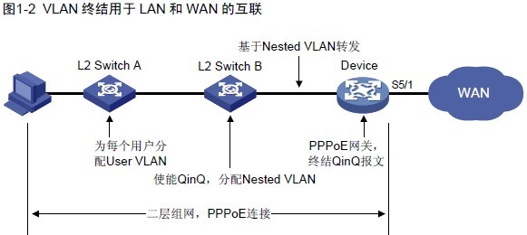 用于实现局域网和广域网的互联。局域网内的报文大多数都带有VLAN Tag,但一些广域网协议并不识别VLAN报文,比如ATM、FR和PPP等,这种情况下,如果要局域网的VLAN报文转发到广域网,需要在本地记录报文的VLAN信息,去掉该信息后再转发。如 图1-2所示,用户的报文发送到L2 Switch A时,会被封装上一层VLAN Tag(User VLAN),报文发送到L2 Switch B时,会再被封装上一层VLAN Tag(Nested VLAN),在网络提供者的LAN内,基于Nested VLAN进行转发,如果报文要发往外部WAN,则需要在出口网关(Device)上对QinQ报文进行终结处理,再通过同异步串口Serial 5/1 发送到WAN。