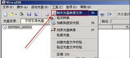 把需要制作映像的光盘插入物理光驱,然后运行UltraISO→菜单栏→工具→制作光盘映像文件→(如图2)