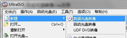 运行UltraISO→菜单栏→文件→新建→数据光盘映像(如图1)→