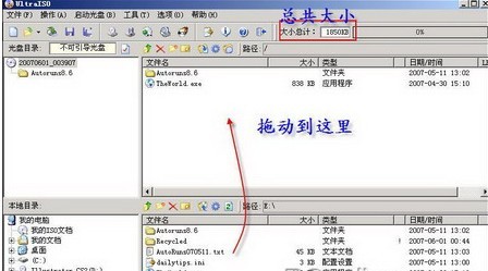 "本地目录”下浏览找到需要增加的文件/文件夹,把它们拖动到“待选目录”里(或者直接单击右键选择添加),要记得看光盘的总容量,如果你想用这个iso文件刻盘,那么总大小可不能超过刻录光盘的大小哦。 见图2