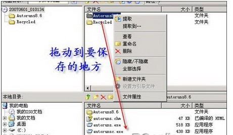 菜单栏→文件→打开→打开你要提取文件的iso→“本地目录”里选择提取文件保存的位置→在“待选目录”里选择你提取的文件/文件夹→直接拖动到“本地目录”里(或者直接在待选目录中选定要提取文件单击鼠标右键选提取)见图3