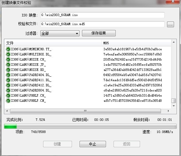 在"校验和文件"里选择校验文件保存目录→创建→就创建了一个后缀名为md5的校验文件(见图2)