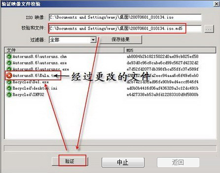 菜单栏→文件→打开→打开需要做文件校验的映像文件→菜单栏→验证文件校验→在"校验和文件"里选择校验文件→验证→这时该映像文件被修改的文件将以警告符号标示出来,有无被修改就一目了然了。见图3