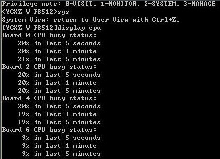 现在的核心交换机设备中,往往同时安装有多块不同的插卡,每块插卡最多集成了24个光纤交换端口,如果某个交换端口的数据流量特别大,那么该交换端口所在的主板插卡CPU资源就可能被大幅消耗,严重的时候能造成该主板插卡发生瘫痪状态,此时连接到该主板插卡上的所有交换端口都将不能正常工作,那么连接到各个光纤交换端口下的工作子网都将不能正常上网。很显然,当局域网中有多个不同的工作子网同时不能上网访问时,那么我们就要检查判断交换机的插卡工作状态是否正常了。而检查判断交换机的插卡工作状态,最简单的方法就是使用交换机的display cpu命令,来观察它们的CPU消耗率,如果发现某块插卡的CPU消耗率超过50%,那么这很可能存在某个交换端口数据流量特别大的现象,此时我们就需要依次查看每一个光纤交换端口的流量状态,找到有异常的交换端口,并将该端口暂时关闭掉,就能让核心交换机上对应插卡的工作状态恢复正常了。下面是使用display cpu命令,查看核心交换机插卡工作状态的具体操作步骤:
