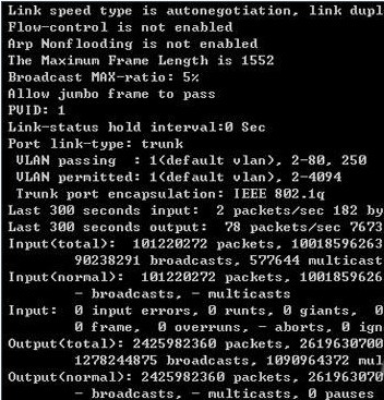 前面本文曾提到,要是发现交换机的某个插卡工作状态不正常时,那就需要依次查看对应该插卡设备上的每一个交换端口的带宽流量,那么我们该如何查看某个特定光纤交换端口的流量状态呢?其实很简单,我们可以使用display int命令来完成任务;借助display int命令,我们不但可以查看指定光纤交换端口的带宽流量,而且也能查看普通的以太端口的带宽流量;除了流量信息之外,该命令也能查看出目标交换端口的其他一些状态信息,例如端口的链路类型、双工模式、工作速度、流量控制、网线类型等信息。