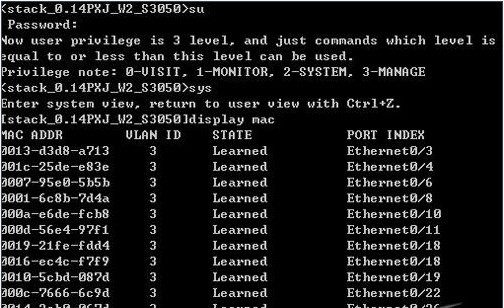 之后根据Vlan号码找到具体的二层交换机,以特权帐号登录进入目标二层交换机的后台管理系统,再将该系统切换进入到全局配置状态,在该状态的命令行提示符下输入“display mac”字符串命令,此时系统屏幕上会出现如图3所示的结果界面,从中找到发生了冲突现象的mac地址,再将对应该记录的端口号码记录下来;
