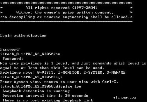 默认状态下,可管理交换机的网络环路测试功能并没有处于启用运行状态,为了让该功能发挥应用的作用,我们可以使用简单的功能命令“loopback-detection enable”,来将网络环路测试功能启用成功。如果不清楚某个交换端口是否开启了网络环路测试功时,我们可以在交换机的后台管理界面,先执行“sys”命令,进入目标交换机系统视图模式,在该模式状态下输入字符串命令“display loo”,从其后弹出的如图4所示结果界面中,如果能发现类似“loopback-detection is running”这样的内容时,那就说明该交换机系统的网络环回测试功能已经处于启动运行状态。