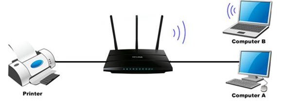 TL-WDR4310提供了网络打印服务器的功能,可以实现局域网电脑共享打印机的需求,共享打印的网络连接图如下图所示。