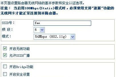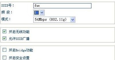 如上图,配置SSID号为fae;频段为6;模式为54M(802.11g);开启无线功能;不勾选开启安全设置。