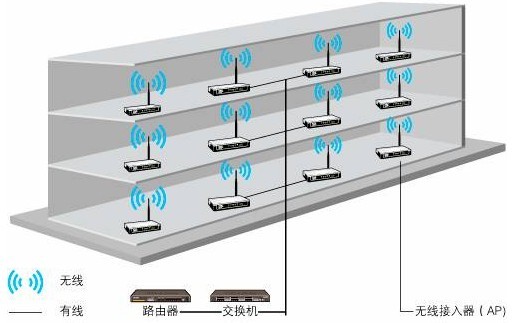 2、楼层间使用有线主干连接,保证网络稳定性。