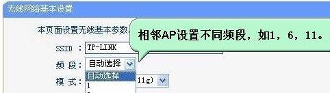 3、 “无线参数”—“基本设置”。相邻摆放的AP设置不同的频段,且相距5个频段以上,避免相互间干扰,如使用1,6,11频段。