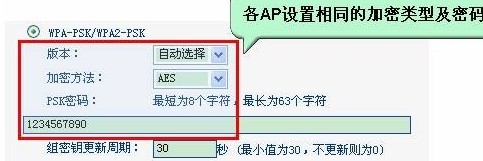 4、 “无线参数”—“安全设置”。各AP设置相同的加密认证方式及密码。