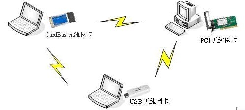 点对点无线网络又叫Ad-Hoc网络,主要适用于有临时需求的双机互连。Ad-Hoc网络没有有线基础设施的支持,网络中不存在无线AP,网络中的节点均由移动主机构成。不管是台式机还是笔记本电脑,只要有两台或者两台以上配有无线网卡的计算机,只需简单设置,就能随时随地实现无线局域网连接。基本结构如下图所示: