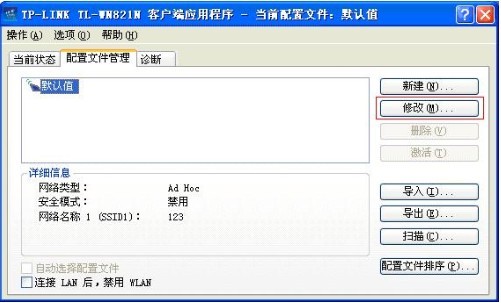 步骤2:运行TL-WN821N客户端应用程序,选择“配置文件管理”。此时您可以新建一个配置文件或者修改原有的配置文件。