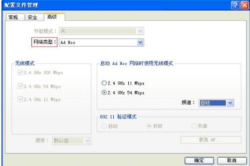 步骤3:进入配置文件管理界面后,选择“高级”选项卡。“网络类型”选择“Ad Hoc”模式即可。