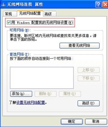 步骤1:在笔记本上双击无线连接图标,弹出无线网络连接属性框。然后切换到“无线网络配置”选项卡,勾选“用Windows配置我的无线网络设置”选项,如下图所示。