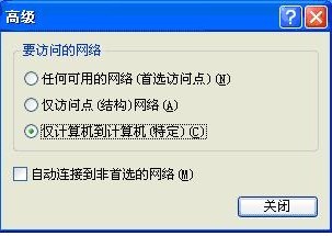 步骤2:单击右下角“高级”按钮,将会弹出如下图所示对话框。在其中点选“仅计算机到计算机”选项,然后去掉“自动连接到非首选的网络”复选框,最后单击“关闭”按钮。