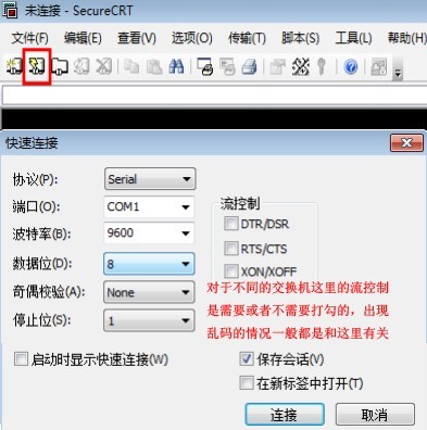 注意的是:win7下使用 SCRT 连接不同品牌的交换机对流控的选择不一样。如果出现乱码就一定和这里有关系。