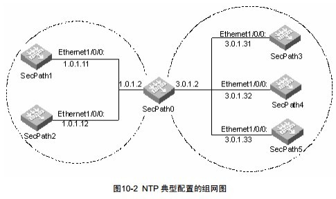 SecPath3设置本地时钟作为NTP主时钟,层数为2,并从接口Ethernet 1/0/0向外发送广播消息包,设置SecPath4和SecPath1分别从各自的接口Ethernet 1/0/0监听广播消息。