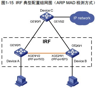 为了防止万一IRF链路故障导致IRF分裂、网络中存在两个配置冲突的IRF,需要启用MAD检测功能。因为成员设备比较少,我们采用ARP MAD检测方式来监测IRF的状态,复用链路上行传递ARP MAD报文。为防止环路发生,在IRF和Device C上启用生成树功能。