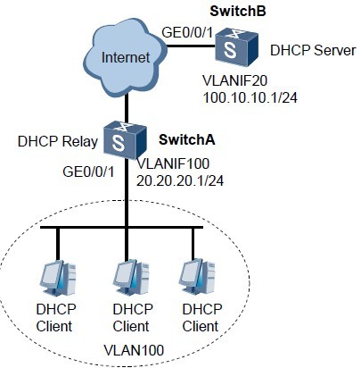 如图1,DHCP 客户端所在的网段为20.20.20.0/24,而DHCP 服务器所在的网段为100.10.10.0/24。需要通过带DHCP 中继功能的Switch 中继DHCP 报文,使得DHCP 客户端可以从DHCP 服务器上申请到IP 地址等相关配置信息。