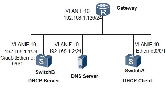如图1 所示,SwitchA 作为DHCP 客户端,从作为DHCP 服务器的SwitchB 中获取动态绑定的IP 地址、DNS 服务器、网关地址等信息。