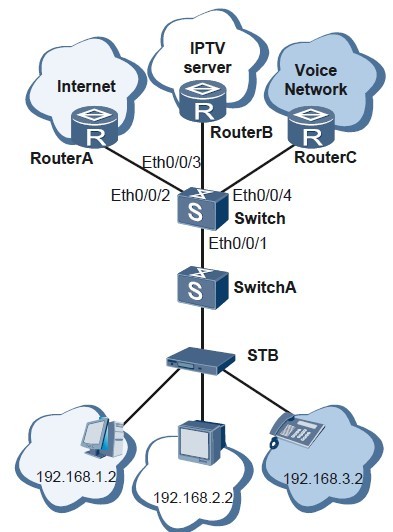 某企业拥有多种业务,如IPTV、VoIP、Internet等,每种业务使用的IP地址网段各不相同。为了便于管理,现需要将同一种类型业务划分到同一VLAN中,不同类型的业务划分到不同VLAN中。如图3所示,Switch接收到用户报文有数据、IPTV、语音等多种业务,用户设备的IP地址网段各不相同。现需要将不同类型的业务划分到不同的VLAN中,通过不同的VLANID分流到不同的远端服务器上以实现业务互通。