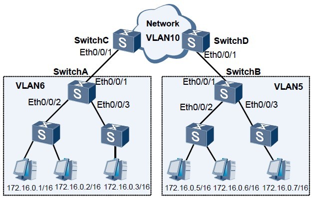在如图1所示的网络中,VLAN6内的用户需要通过网络中的VLAN10与VLAN5内的用户通信。