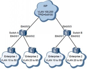 如图1所示,网络中有两个企业,企业1有两个分支,企业2有两个分支。这两个企业的各办公地的企业网都分别和运营商网络中的SwitchA和SwitchB相连,且公网中存在其它厂商设备,其外层VLAN Tag的TPID值为0x9100。