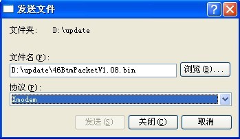 (6) 选择BootWare升级文件46BtmPacketV1.08.bin(或者更高版本),开始升级,协议选择Xmodem