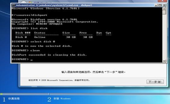 E.输入“clean”命令并按下“回车”键来请除您硬盘中的所有分区及数据: