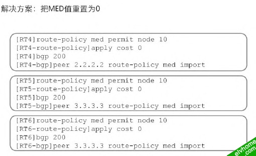 以上情况观察可看出,由于外部的med值发送到AS内,默认情况下BGP不修改med,从而导致不可以预料的结果,所以我们在AS内部应该不要用外部的med来参与计算路径的选择,当然这只是其中一种解决办法。